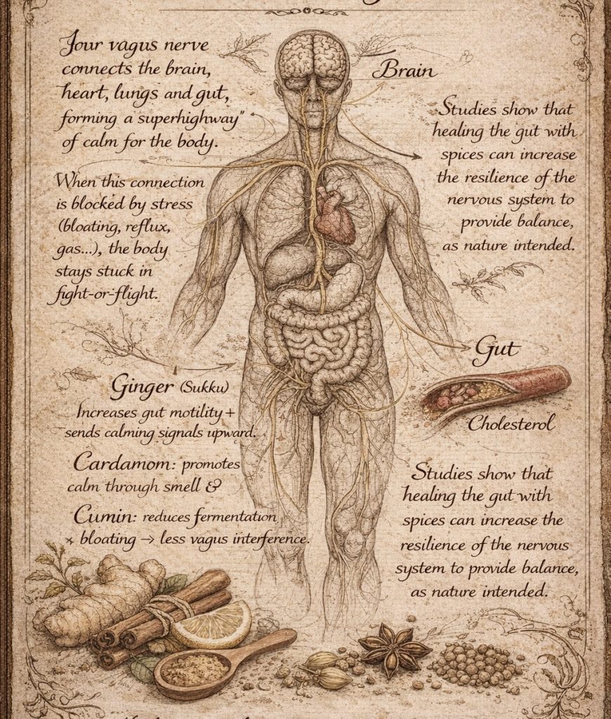 The vagus nerve regulates heart rate, blood pressure, digestion, inflammation, and the body’s ability to exit stress. Approximately 80% of its fibers are afferent, meaning they carry information from the gut to the brain.